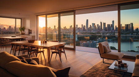 A stylish living room showcases a spacious layout with a cozy sofa and coffee table, framed by large windows revealing a stunning sunset over the city skyline.