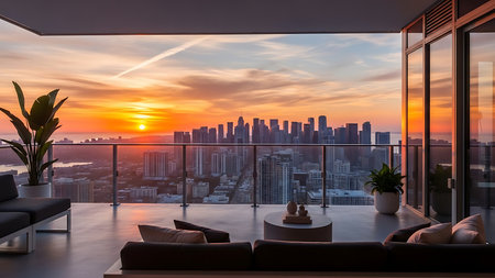A modern balcony setting reveals comfortable furniture facing a cityscape. The vibrant sunset paints the sky with warm colors, creating a soft, ambient glow over the buildings and mountains. This image could be ideal for various commercial applications, including home decor, travel, or lifestyle content.