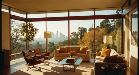 Stylish living room with leather furniture and plants, warm sunlight streaming through large windows, city skyline in background, cozy mood