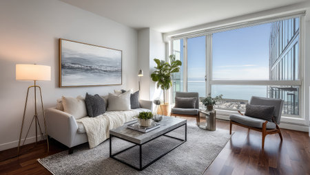 Experience modern urban living in this stylish living room featuring sleek furniture, expansive windows, and a view of the city and lake. This inviting space is perfect for relaxation and social gatherings, showcasing a blend of comfort and contemporary design.