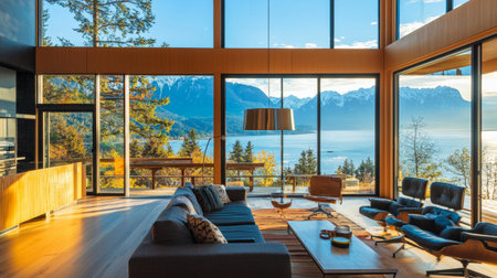 A cozy living room featuring a comfortable sofa with a breathtaking view of mountains and a serene lake, perfect for relaxation and escaping the hustle.