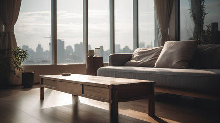 Contemporary living room with a comfortable sofa, wooden coffee table, and lush indoor plants, illuminated by sunlight streaming through large windows, creating a warm ambiance