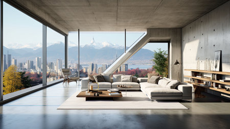 Living room decor, home interior design . Contemporary Industrial style with Large Windows decorated with Concrete and Leather material . Generative AI AIG26.
