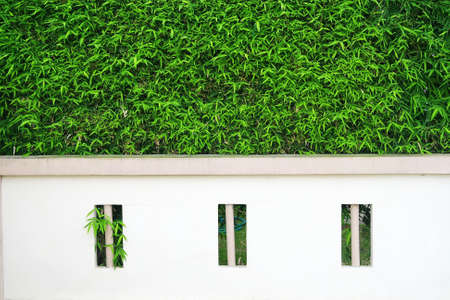 Green tree wall fence with concrete white wall background