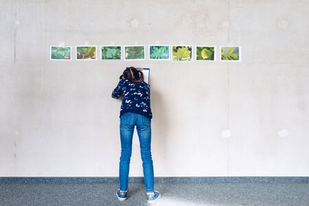Little girl recognizes tree species on the basis of plant photos at ecological and natural workshops - eco awareness concept