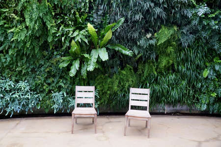 A variety of green fern plants growing on the wall by two empty white chairs