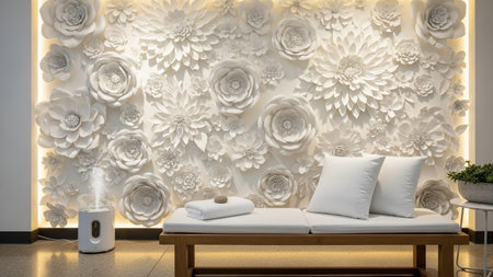 A tranquil spa waiting area a wall adorned with numerous white paper flowers and a wooden bench with cushions.