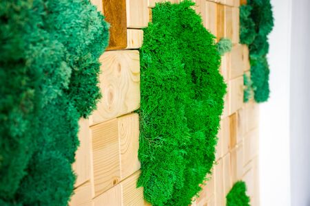 Stabilized green moss on the wall surrounded by wood bricks in the interior. Preserved moss wall art and the use of elements of nature and flora in the interior design