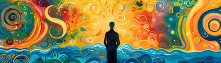 This captivating and visually striking image depicts a solitary human figure silhouetted against a vibrant surreal landscape of swirling colors shapes and energy The scene evokes a sense of