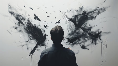 Male artist Transforming into Birds While Drawing