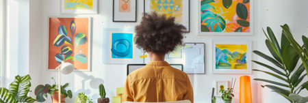 Visitor admires diverse artworks in a contemporary gallery during a sunny afternoon