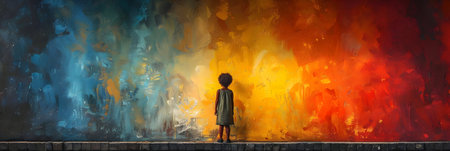 A person stands in front of a vibrant abstract painting, engaging with the creative expression in a contemporary gallery, experiencing emotions of modern art.