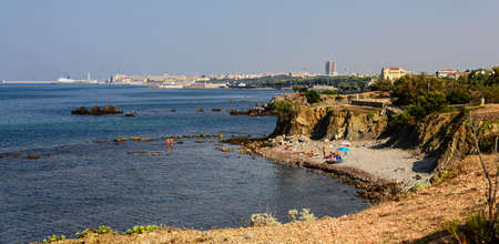 Livorno, Italy - 01 July 2023: Boccale Castle, seascape sunset. Rock and sea water.