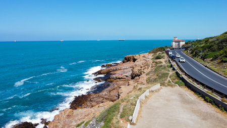 AI Generated. Scenic rocky coastline featuring a historic brick structure and tranquil sea under a clear blue sky