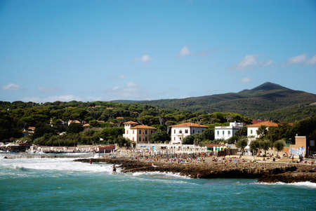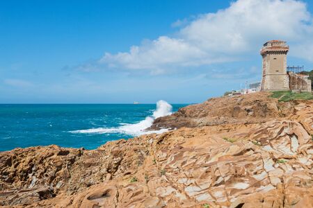 Beautiful azure sea, castle and the rocky beach, Tyrrhenian sea in Tuscany, Italy