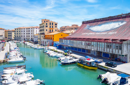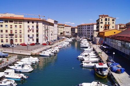 Livorno, Italy -May 25,2016: View of Delle Ancore canal with a well-known fish market on the right