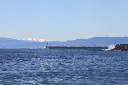 Quay stretching on the sea with a mountain ridge in the distance, and a breakwater with waves crushing on it in the foreground seen from the distance