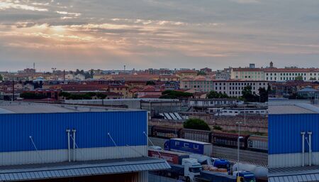 LIVORNO, ITALY - JULY 12, 2019: Cargo port and dawn cityscape. Livorno is a port city on the Ligurian Sea on the western coast of Tuscany. The port processes thousands of cruise-ship passengers.