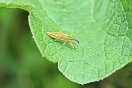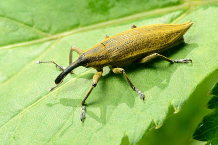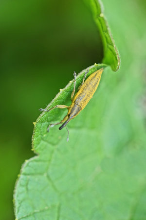 Macro of pest weevil beetle (Lixus iridis) on green leaf at spring