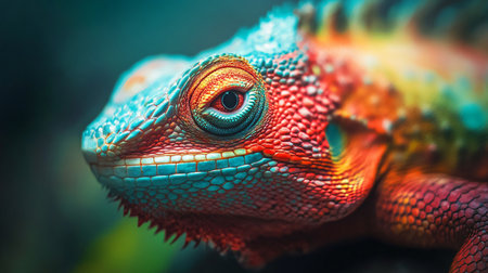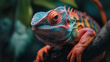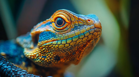 A vibrant close-up image of a reptile showcasing its colorful scales and striking eyes. The detailed texture highlights its natural beauty in a captivating pose.