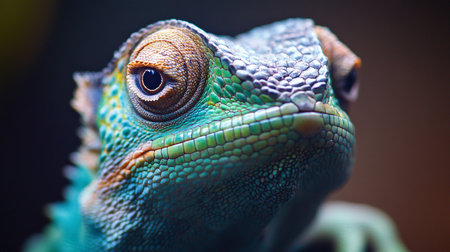 Highly detailed close-up image of a lizard's head, showcasing its intricate scales and vibrant colors against a dark background. The image focuses on the texture and patterns of the scales, highlighting the iridescent qualities of the skin.