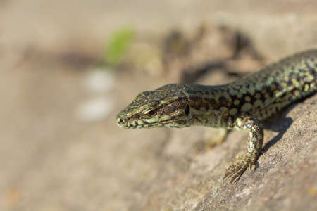 A selective focus shot of a cute small lizard hanging out. small reptile caught at sunbathing.