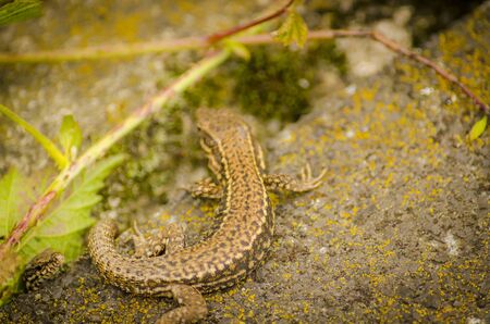 podarcis lizard on a stone wall sunbathing in spring in Spain
