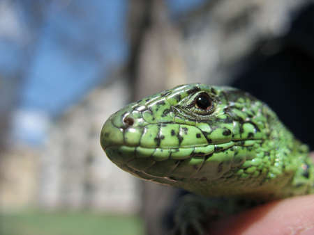 The head of a female lizard, macro photo of the head of a female lizard, Lacerta agilis