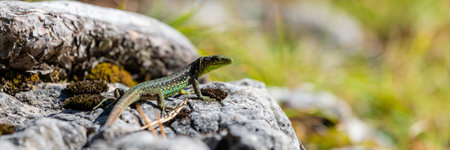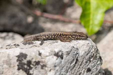 Common wall lizard sunbathing on a rock in the morning (Podarcis Muralis)