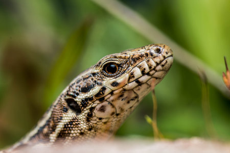 A macro shallow focus shot of a face of a common lizard with a blurred planted background