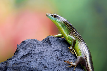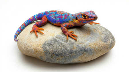 A vibrant lizard displays its colorful scales while perched on a smooth, textured rock, creating a striking contrast against a clean, white background.