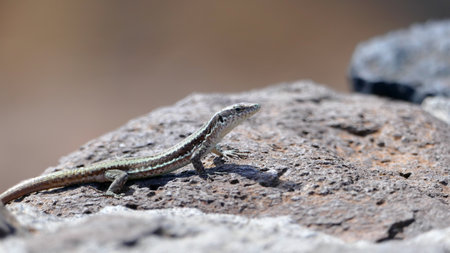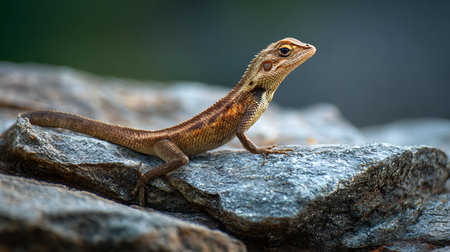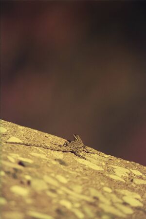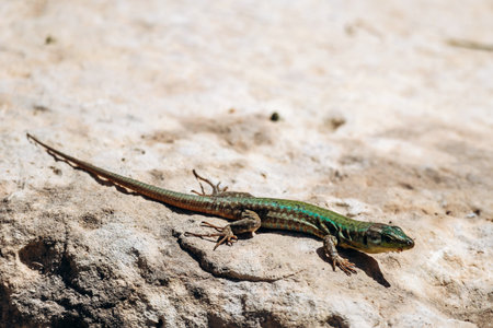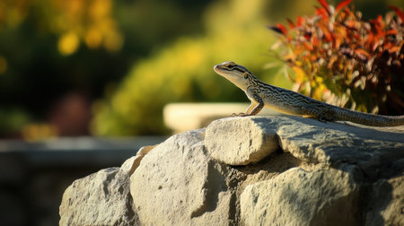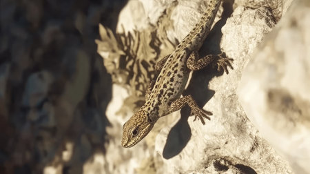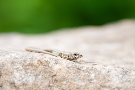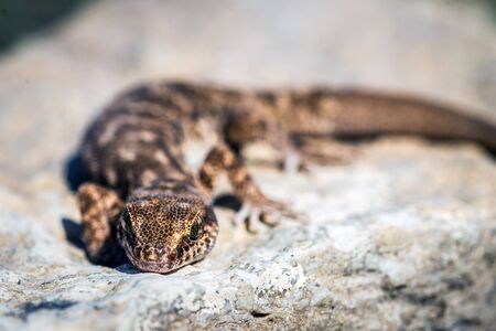 Small lizard basking on a warm stone surface in natural daylight. Concept of wildlife, reptile behavior, camouflage, and nature observation in the wild