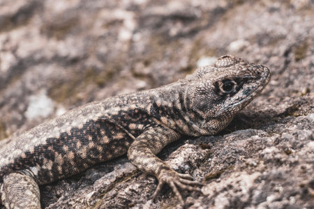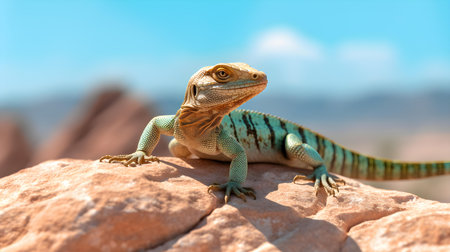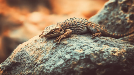 A stunning close-up shot of a lizard resting on a rock, showcasing its intricate scales and textures in a natural setting, emphasizing wildlife beauty and serenity.