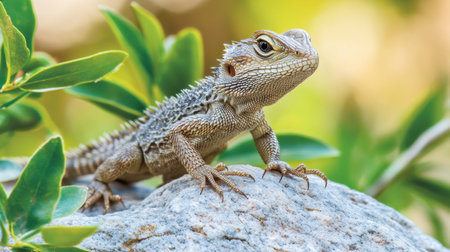 A detailed close-up of a spiky lizard perched on a rock. Surrounded by vibrant greenery, this image captures the essence of wildlife in its natural habitat.