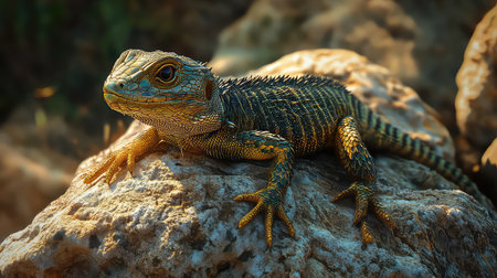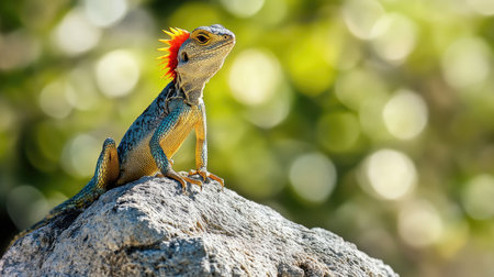 A vibrant lizard rests comfortably on a textured rock, surrounded by natural greenery. The soft sunlight highlights its intricate scales and colors, showcasing the beauty of wildlife in its habitat.
