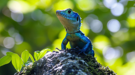 Blue lizard perched on a mossy rock in a sunlight forest. Wildlife and nature photography concept