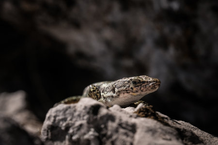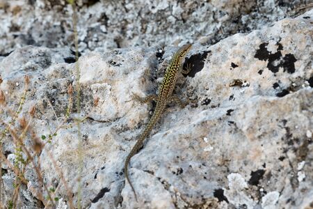 Close up of the filfola lizard or Maltese wall lizard on the lava stone of Linosa, Pelagie island. Sicily