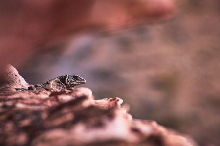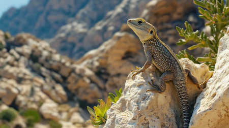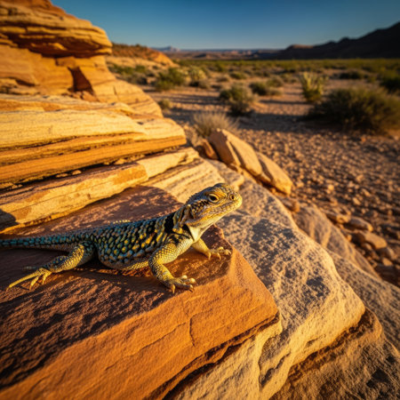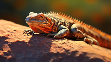 A lizard rests on orange sandstone rocks under sunlight. The image showcases the lizard's details, the rock's texture, and the arid desert landscape. The composition includes geological formations and vegetation. Suitable for environmental, nature, or educational materials.
