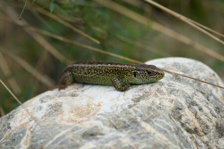 The lizard Lacerta viridis sits on a stone. Background detailed image of a lizard on a stoneon a sunny day, close up with copy space. Wildlife of Animals