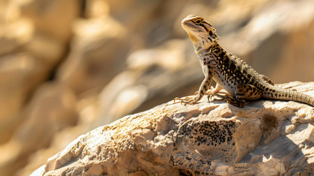Lizard Resting on Sunlit Calico Rock in Desert Environment with Soft Blurred Background