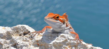 Vibrant Lizard Sunbathing on Rocky Shoreline Near Water with Natural Background, Detailed Scales and Texture in Bright Sunlight During Warm Day