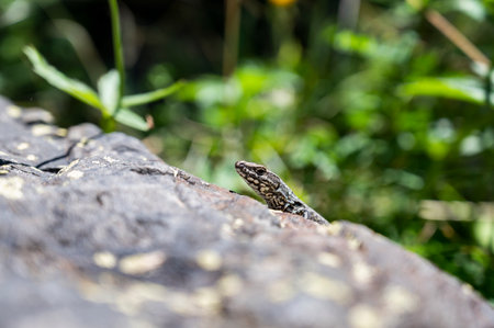 Curious lizard with head stretched out on a stone in Madeira, Portgal