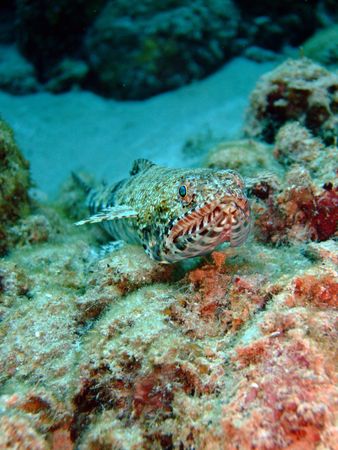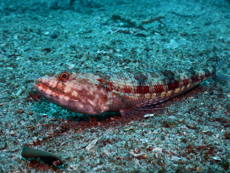 The lizard fish (Synodus variegatus) lies at the bottom, its toothy mouth slightly open, waiting for its prey. Philippines.