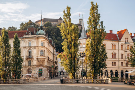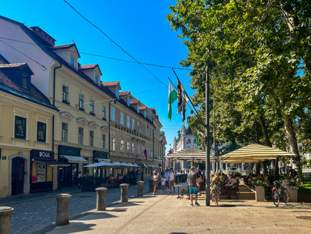 Ljubljana, Slovenia - August 15, 2024: Charming and beautiful city center of Ljubljana at dawn, with soft morning light and peaceful atmosphere