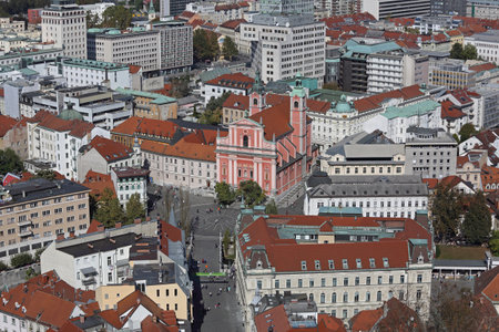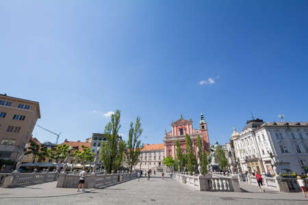 Ljubljana City Center during a Sunny Day overlooking the Triple Bridge and Beautiful Franciscan Church, Slovenia