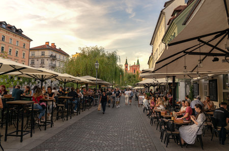 09.08.2021: Ljubljana, Slovenia: People having fun in restaurants and bars next to the Ljubljanica river in Slovenia Ljubjana with Cerkev Marijinega oznanjenja church with the background