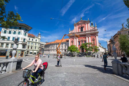 LJUBLJANA, SLOVENIA - JUNE 17, 2021: Woman cycling with her city bik on Presernov trg square, in downtown Ljubljana, one of the most car free capitals of Europe.