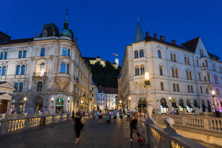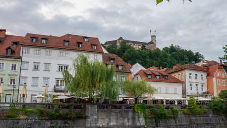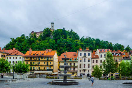 LJUBLJANA, SLOVENIA, JULY 29, 2015: Novi trg - New city square in the slovenian capital Ljubljana is overlooked by a castle situated on a hill across ljubljanica river. Ljubljana is the capital and largest city of independent Slovenia since 1991.