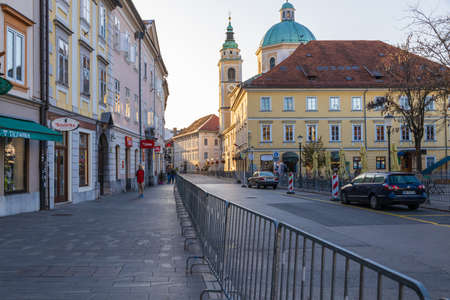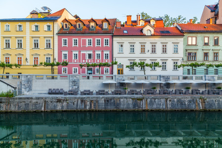 Beautiful streets of Ljubljana and river Ljublajnica in Slovenia in the first rays of sun.