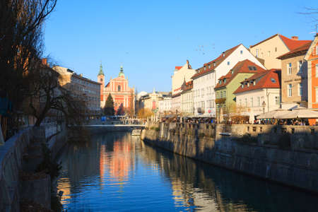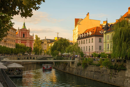 LJUBLJANA, SLOVENIA, JULY 29, 2015: Old town embankment in Ljubljana with the franciscan church of annunciation. Ljubljana is the business and cultural center of the country.